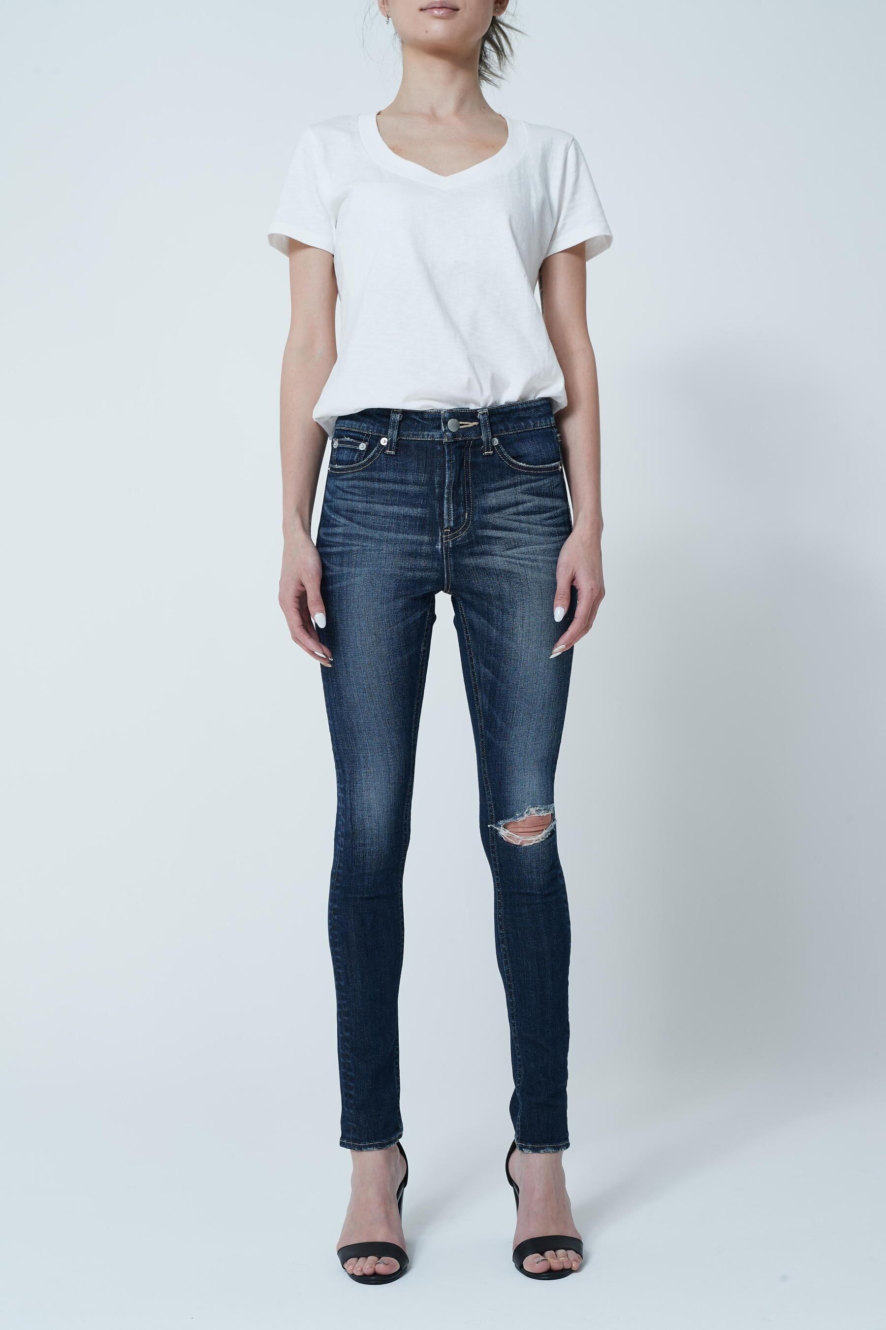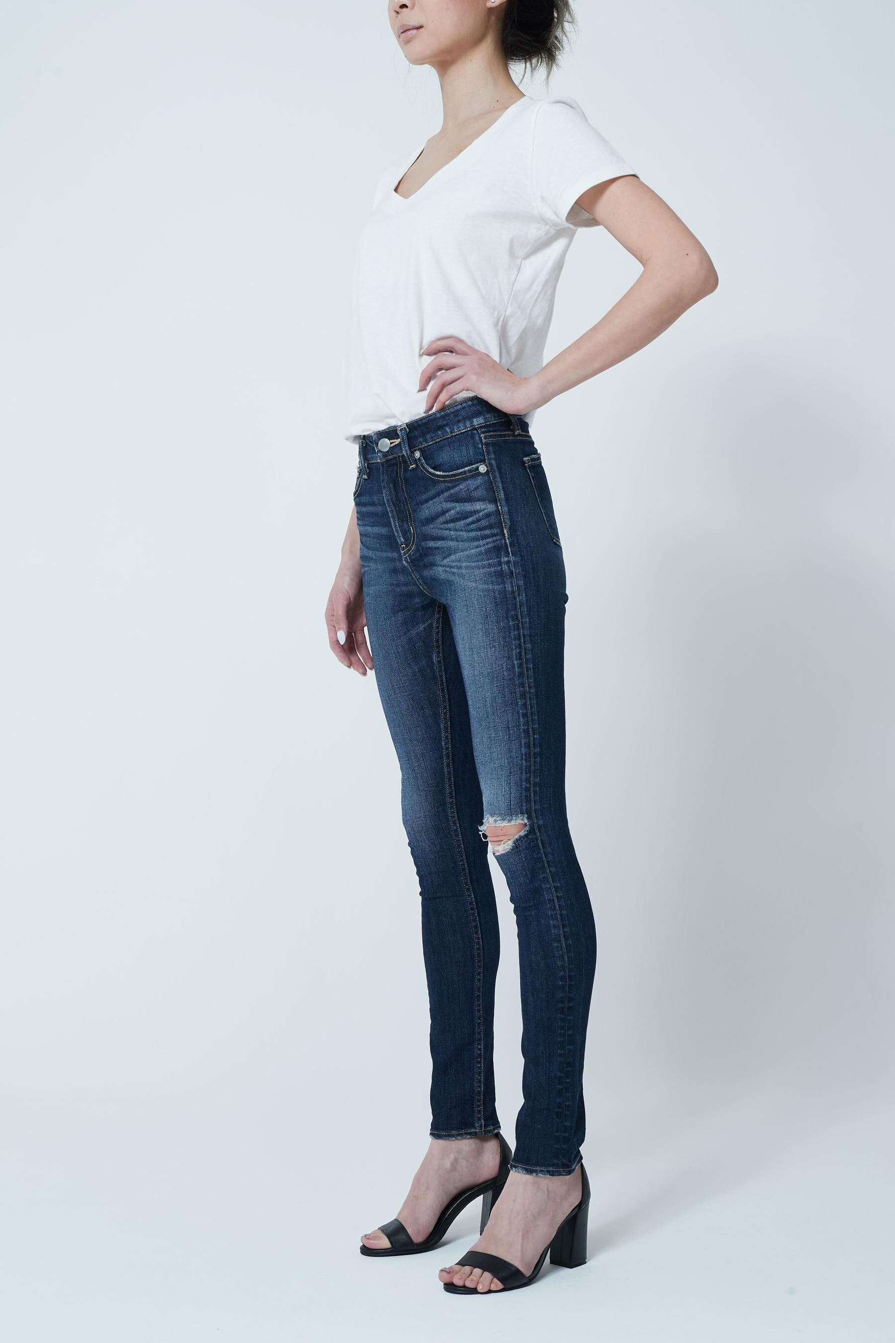 NORMA JEANS BLU オリジナル定番型”モンロースキニーデニム”。ストレッチの効いた12oz素材を使用。生地の段階でアルカリ処理し、ツヤ、光沢感を出しているので、足のラインがセカンドスキンのようにヌーデイーな印象になります。やや強めに入れたヒゲ加工、シェービングを細く入れているので足をスッキリ見せてくれます。多少肉厚でメンズでもよく使われているしっかりとした生地なので、デイリーに履いて、変化していくダメージも楽しんで頂きたいです。タックボタン、リベットはヴィンテージを復刻した加工を施しています。デニムのバックスタイルによくついているパッチにまでもデニム素材を使用しました。