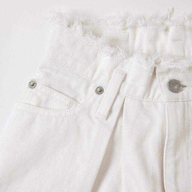 ウエスト部分はベルトがなくてもアクセントになるようにフリンジ加工にしました。初めて履く際は裾がロールアップされてますが、伸ばして履く事も可能です。